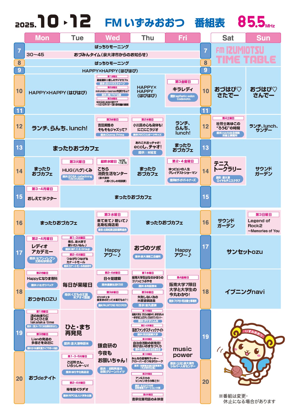 番組プログラム パーソナリティ タイムテーブル トピックス メッセージ タイムテーブル 株式会社エフエム泉大津 TEL 0725-32-0680 大阪府泉大津市池浦町1-8-33 › 1分でわかるFMいずみおおつ › 番組プログラム › パーソナリティ › タイムテーブル › Clubいずみおおつのご案内 › トピックス › 番組へのメッセージ › 会社概要 › プライバシーポリシー › 番組審議会議事録 ©︎FMいずみおおつ All rights reserved.
